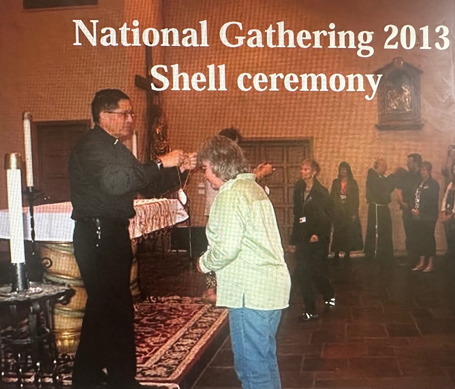 Next, as the priest read these words, another priest lowered a leather cord carrying a lovely white scallop shell over our heads.